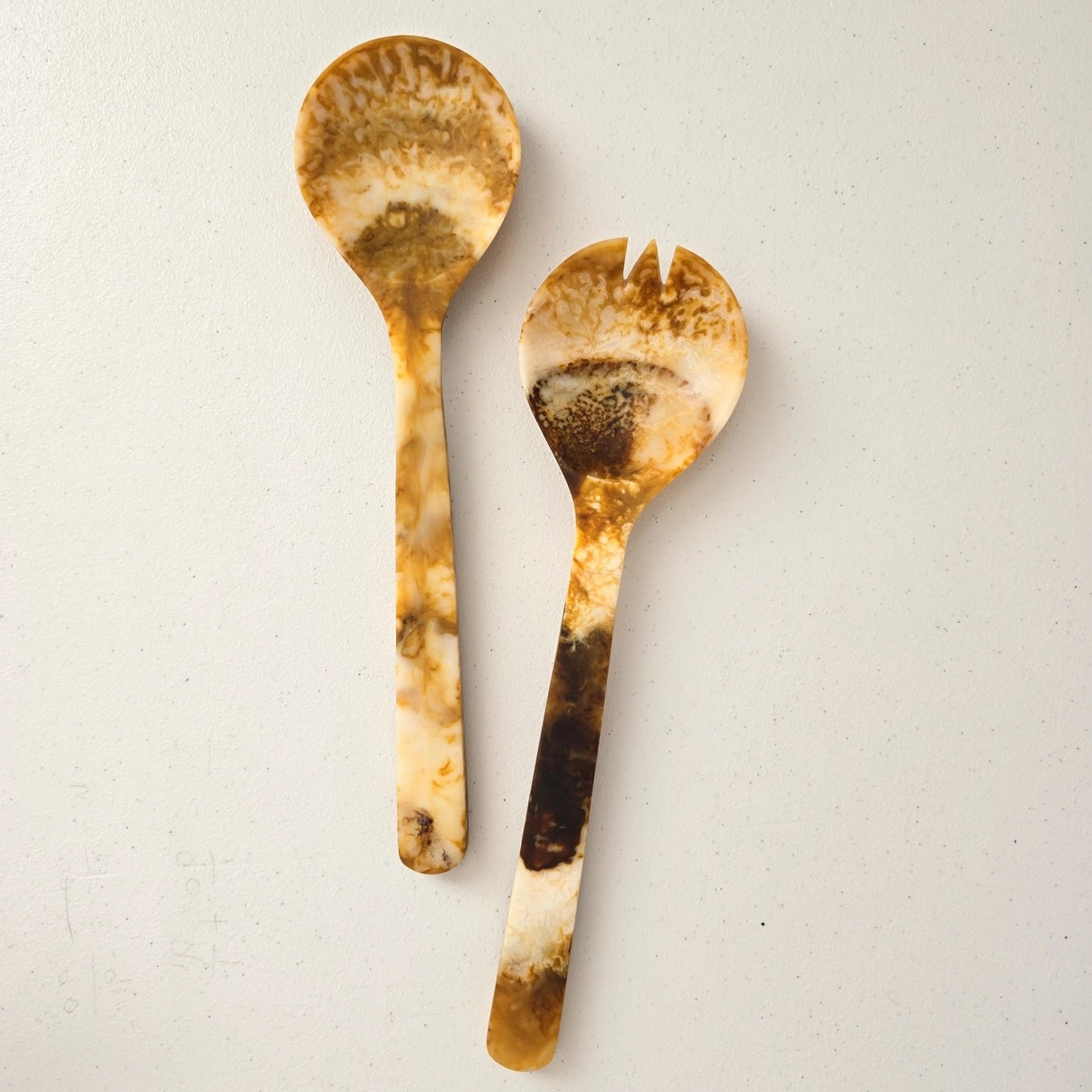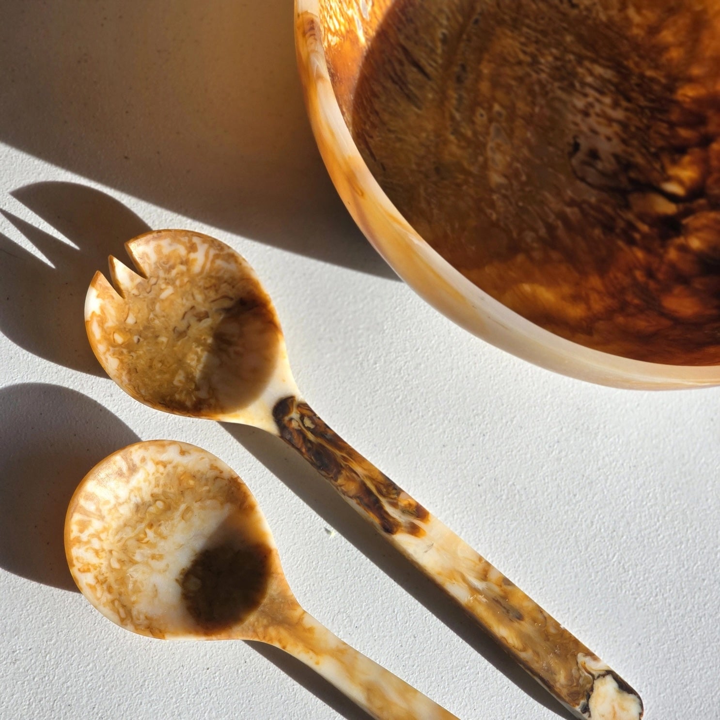 This gorgeous hand-poured resin serving bowl with matching servers is a striking addition to your tablescape. Each one of these handmade bowls is unique in design and color tones. Gibb & Daan's fair trade practices ensure they are created with considerations around supporting human rights and ethical labor, and one or more ingredients or materials are produced and traded in accordance with global fair-trade standards.