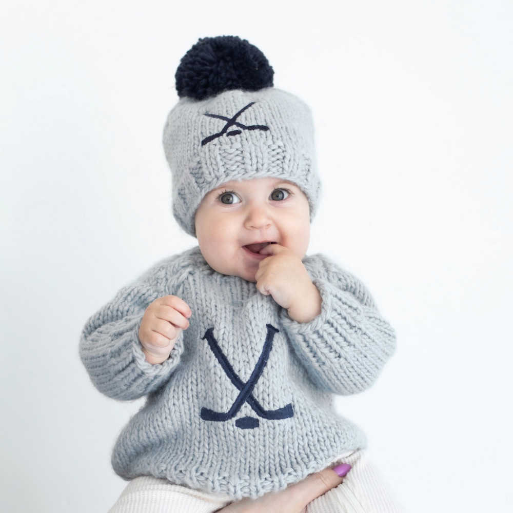 Hockey fans will love this sweet little stick and puck hockey beanie from Huggalugs in light gray with a navy pom pom and navy detailing. It's made of soft and waashable acrylic yarn. Pair it with the matching sweater for the full effect!
