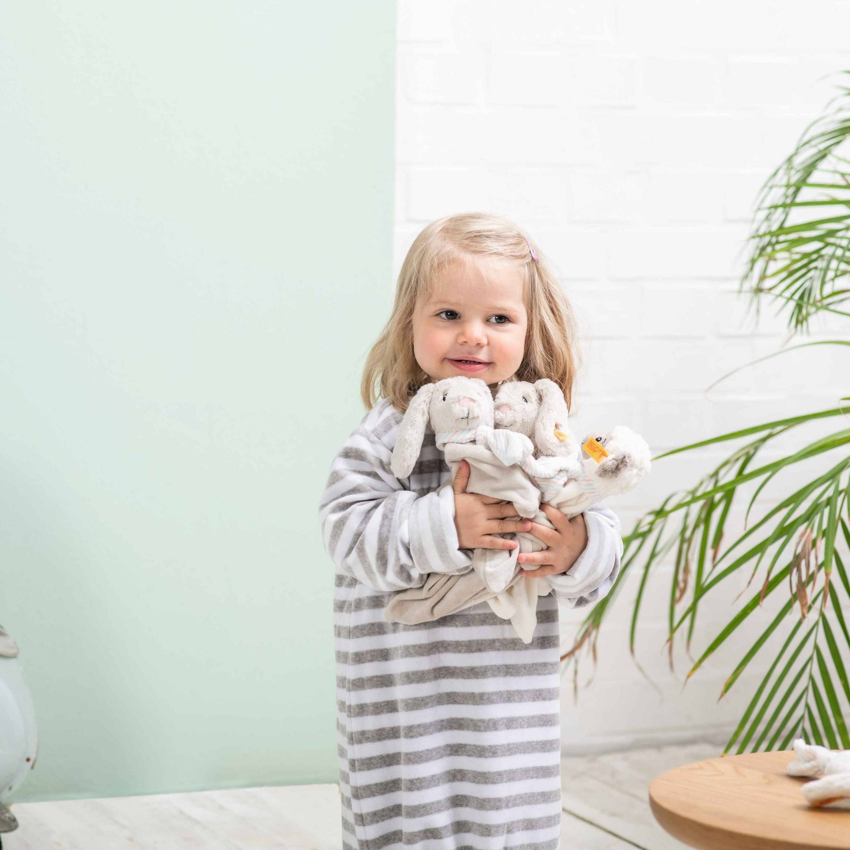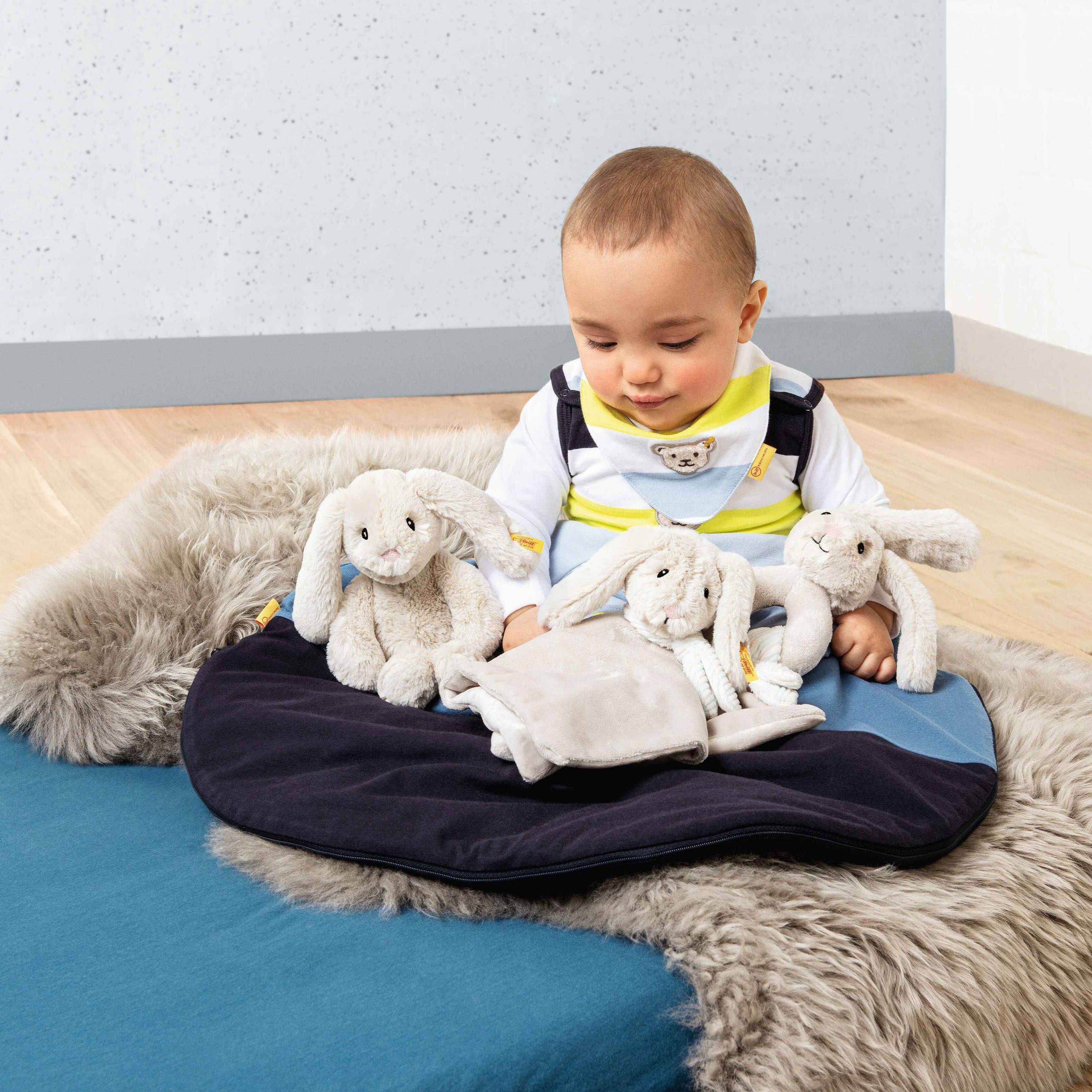 This adorable Hoppie Rabbit security blanket is made of the softest plush and has a sweet little striped scarf. Long ears, a round head and embroidered face are soft and safe for little ones. Like all Steiff products, this Hoppie Rabbit proudly wears the world-famous a Button in ear trademark, the symbol of highest quality and safety.