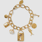 A chunky gold charm bracelet that features smoky quartz, freshwater pearl, a Pegasus coin, articulated fish, and locket and key charms forming a museum of treasures.