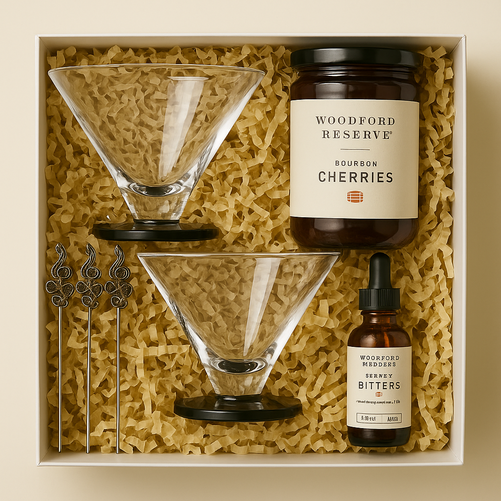 A timeless cocktail set for the perfect night in. Classic bourbon cherries, orange bitters, and sleek snake cocktail picks pair beautifully with two elegant puck glasses, creating everything needed to craft and enjoy a sophisticated Manhattan.