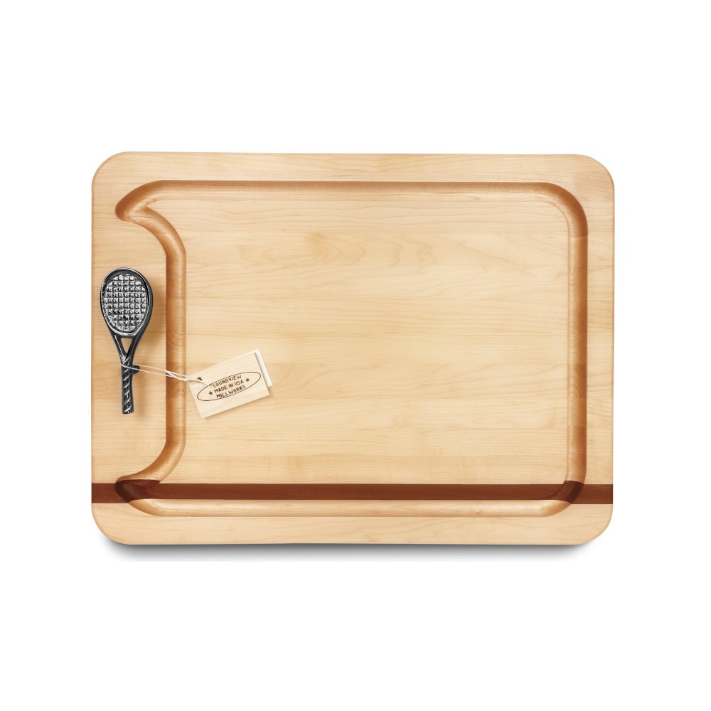 If tennis is your favorite passtime, share it with friends and family with this handcrafted appetizer board, great for cheese and crackers or serving up that special dish. The boards feature a chrome-plated brass tennis racket handle, rounded corners, a recessed juice groove, and Soundview Millworks' signature maple and mahogany design.