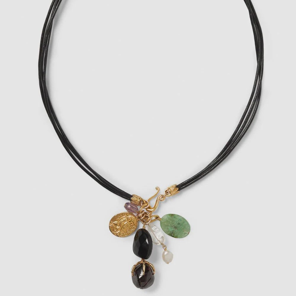 The Narcissus Necklace has a charmingly unexpected construction with green kyanite, onyx, amethyst and garnet attached to a hook detail. The triple layered leather cord softens with wear, molding to the forms of your body.