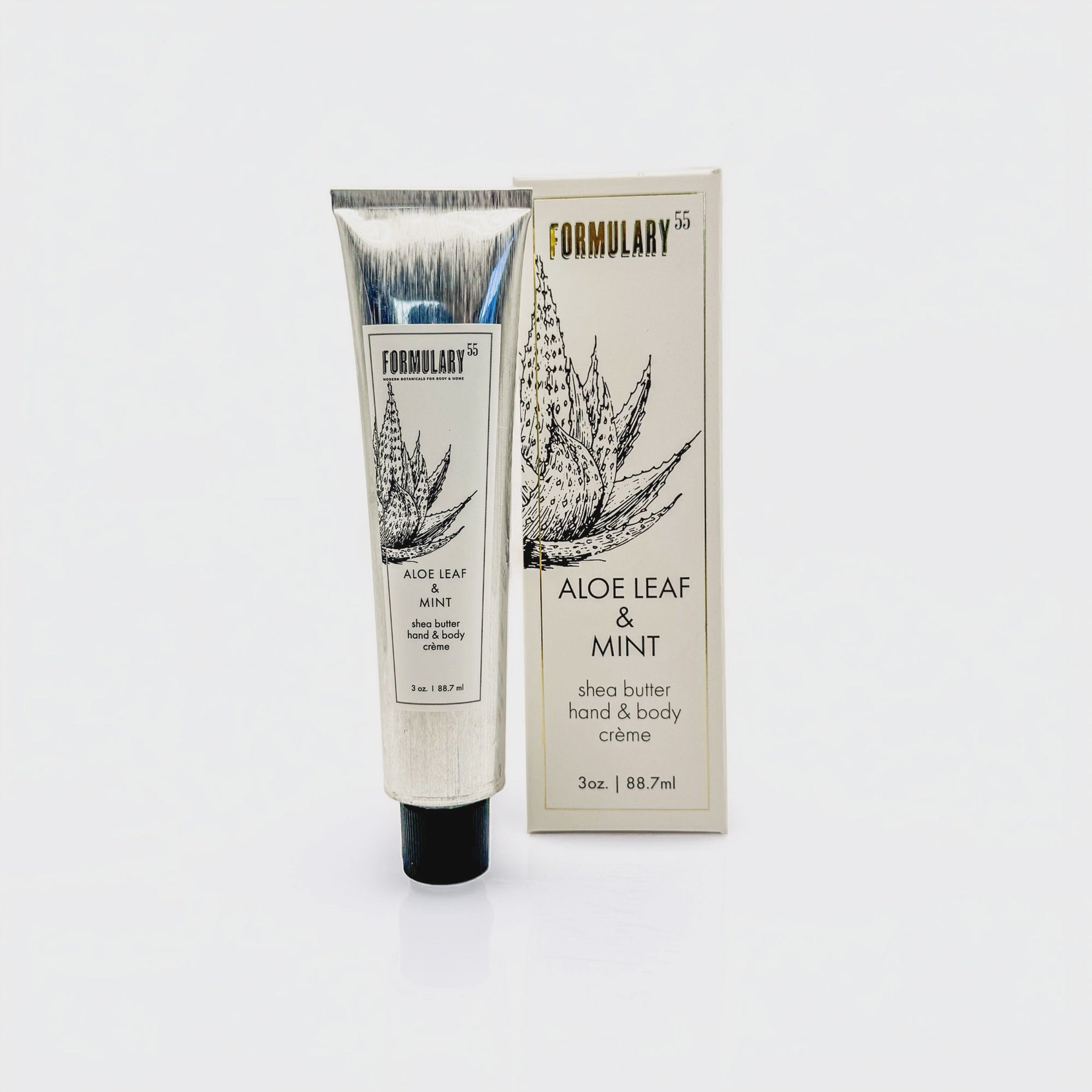 Aloe Leaf & Mint hand and body creme is now in a convenient size that's TSA carry-on approved and perfect for customers who want to take their favorite scents on the go. Each tube comes elegantly packaged in a gift box designed specifically for its fragrance, featuring the signature black and white botanical designs that define the Formulary 55 aesthetic. Inside, aloe leaf and mint is invigorating, zesty and "clean," combining fresh aloe leaf with cooling mint and a touch of black pepper. This lightweight hand creme contains 5% shea butter, making it a rich moisturizer without a heavy greasy feel. Healing aloe and vitamin E help restore softness and elasticity.