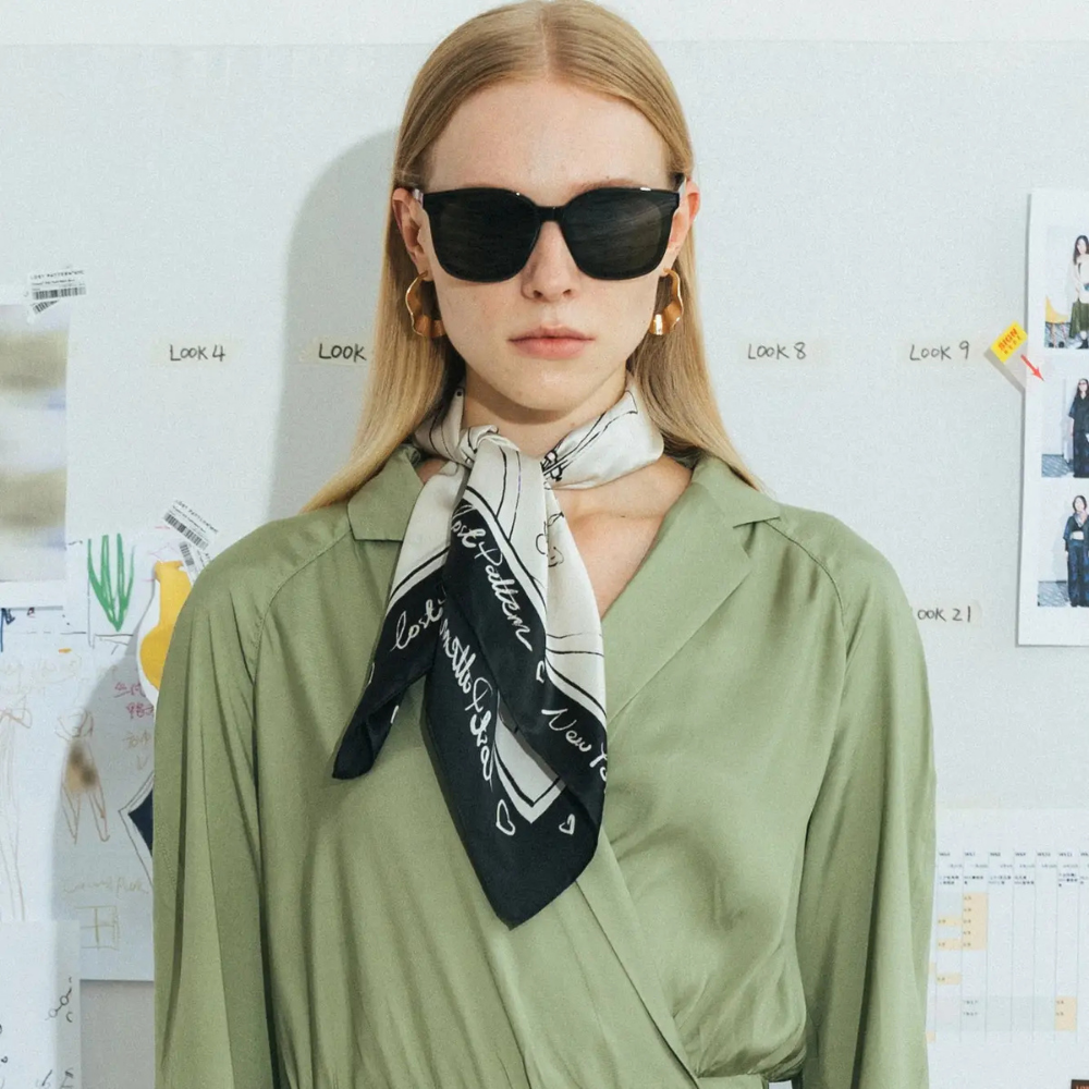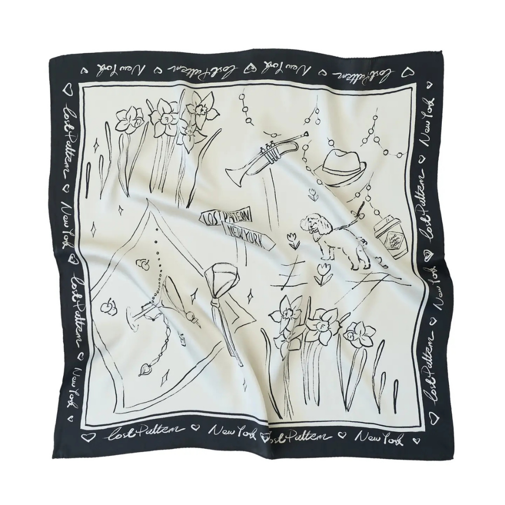 Chief Designer Cata at Lost Pattern NYC has designed this black and white silk scarf as an ode to the city Lost Pattern calls home. The scarf edges are hand-rolled and hand stitched by local artisans to honor traditional silk making. The tag is designed to be recycled as a coaster as part of the company's commitment to sustainability in fashion.