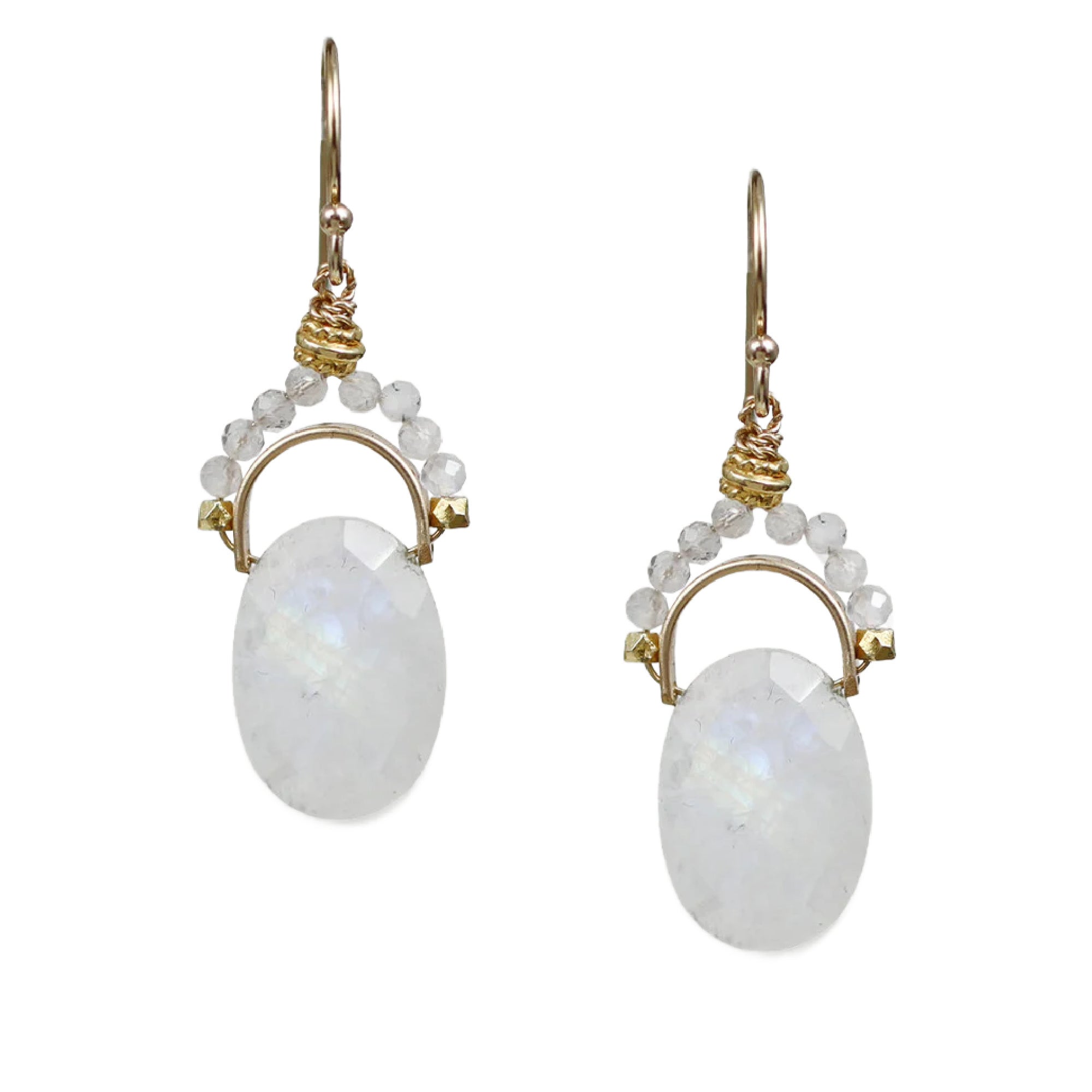 Lulu Designs creates these dangle earrings with oval moonstones elegantly suspended from an arch adorned with shimmering beads.