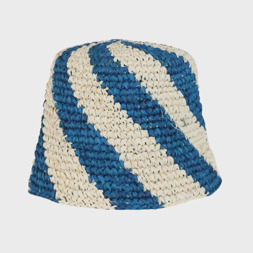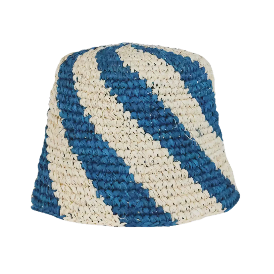 Cool blue and white stripes define the Ocean Wave Sun Hat from Sunshine Tienda. Crafted from raffia, it offers both sun protection and effortless style, perfect for relaxing beach days or coastal adventures.