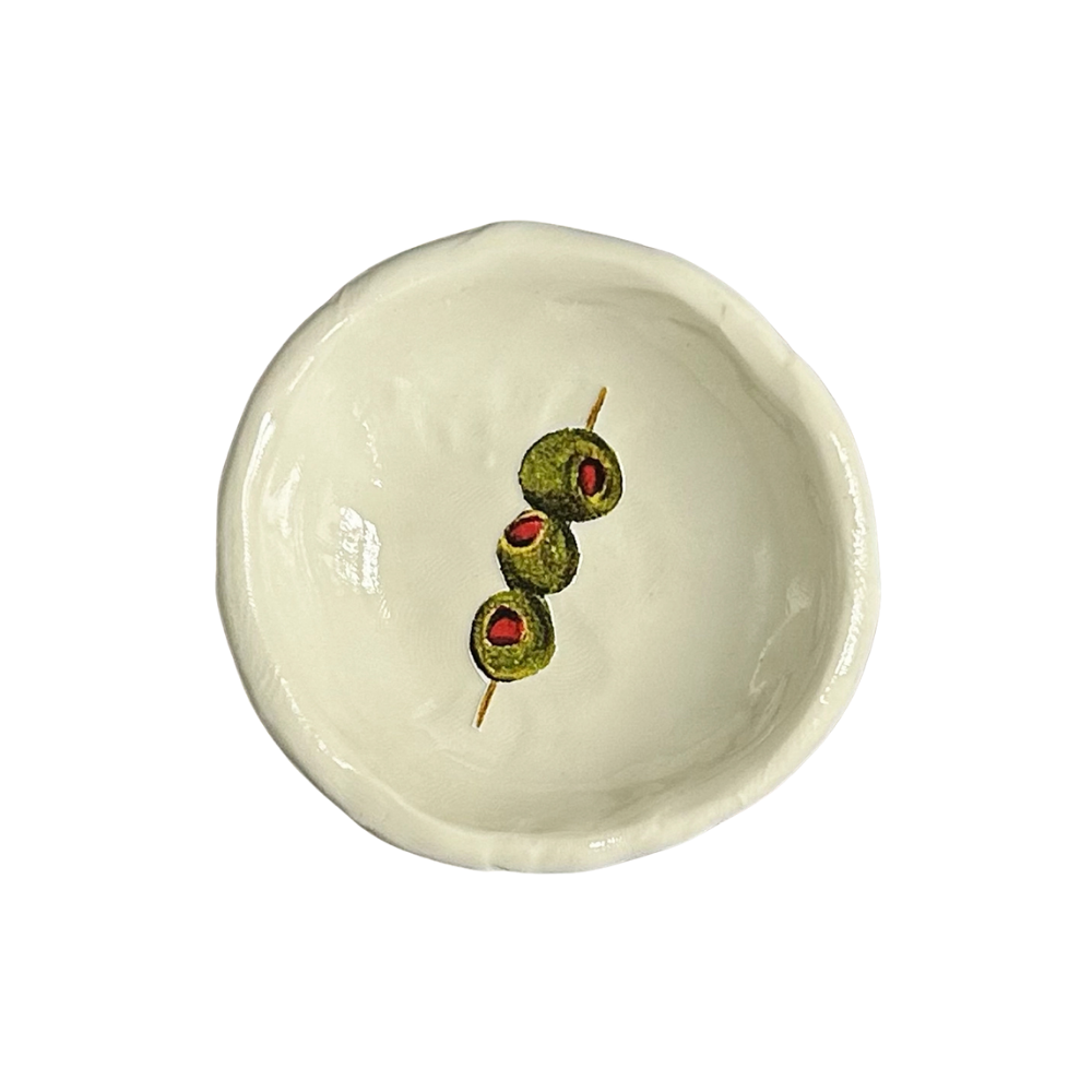 This handmade trinket dish, collaged with an image of a hand-drawn illustration of green olives, is the right size for storing jewelry, vitamins, bobby pins and more. Because each dish is made by hand, no two are exactly alike.