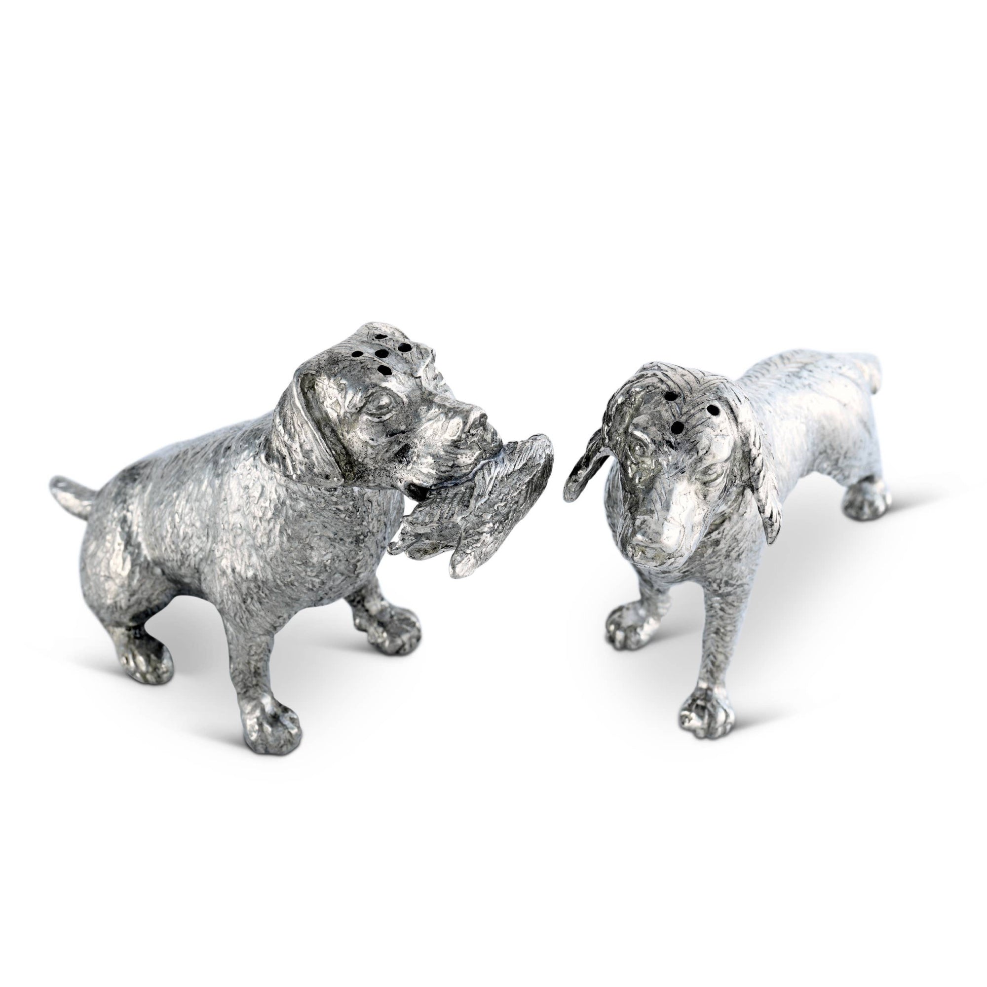 Crafted in such detail that you can imagine their wet noses and eagerness for the hunt, this salt and pepper set depicting a hunter's faithful friends are a perfect table accent for hunting, sport or canine loving homes and occasions. Vagabond House crafts these richly detailed and realistic dogs from luxury pewter as part of the company's Morning Hunt Collection. It's a wonderful gift for nuptials, a housewarming, collectors or just because.