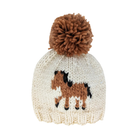 Donning a pecan brown pony design on the front, this hand knit hat is made from chunky natural-hued yarn. The hat is adorned with a matching pecan colored yarn pom pom on top, adding a playful touch to the design. Eco-friendly, each hat is partially knit from recycled, sustainable polyester yarn, which is made from plastic bottles.