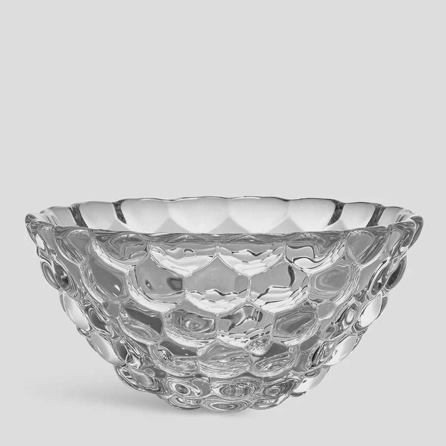 The large Raspberry bowl in clear crystal has a design resembling a raspberry with its round "drupelets" giving it a soft look. Its large size is ideal for serving a side dish or displaying as a work of art.