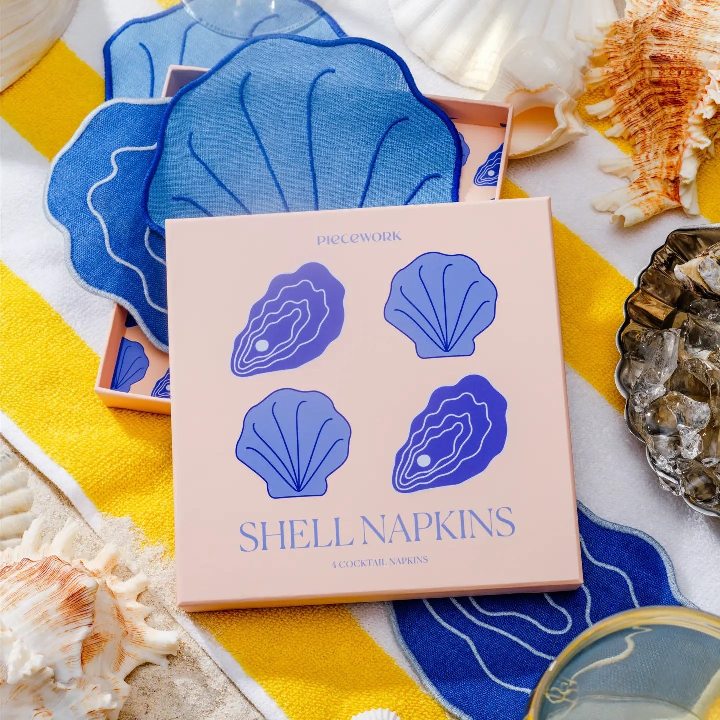 Sold as a set of 4, these 100% linen blue shell-shaped napkins are embroidered with cotton thread. Handwash in delicate detergent, air dry, and gently iron, or dry clean.