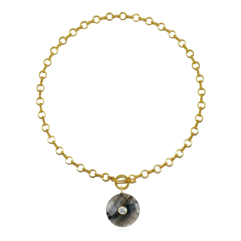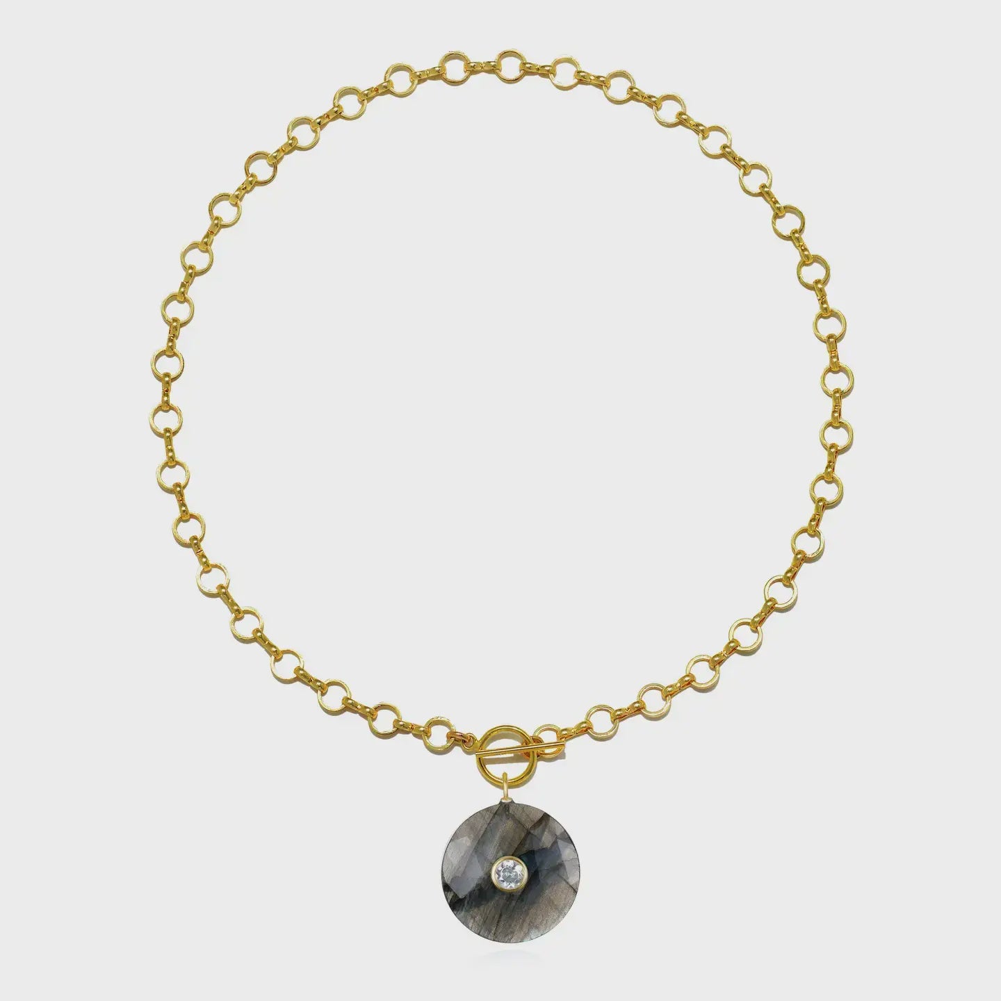 Natural labradorite faceted coin pendant is bezel set with white topaz, 14K gold-plated petite loop chain with 14K gold-filled toggle front closure. The long 18" length. and the combination of genuine labradorite and topaz elevates the every day or can carry you from day to night.