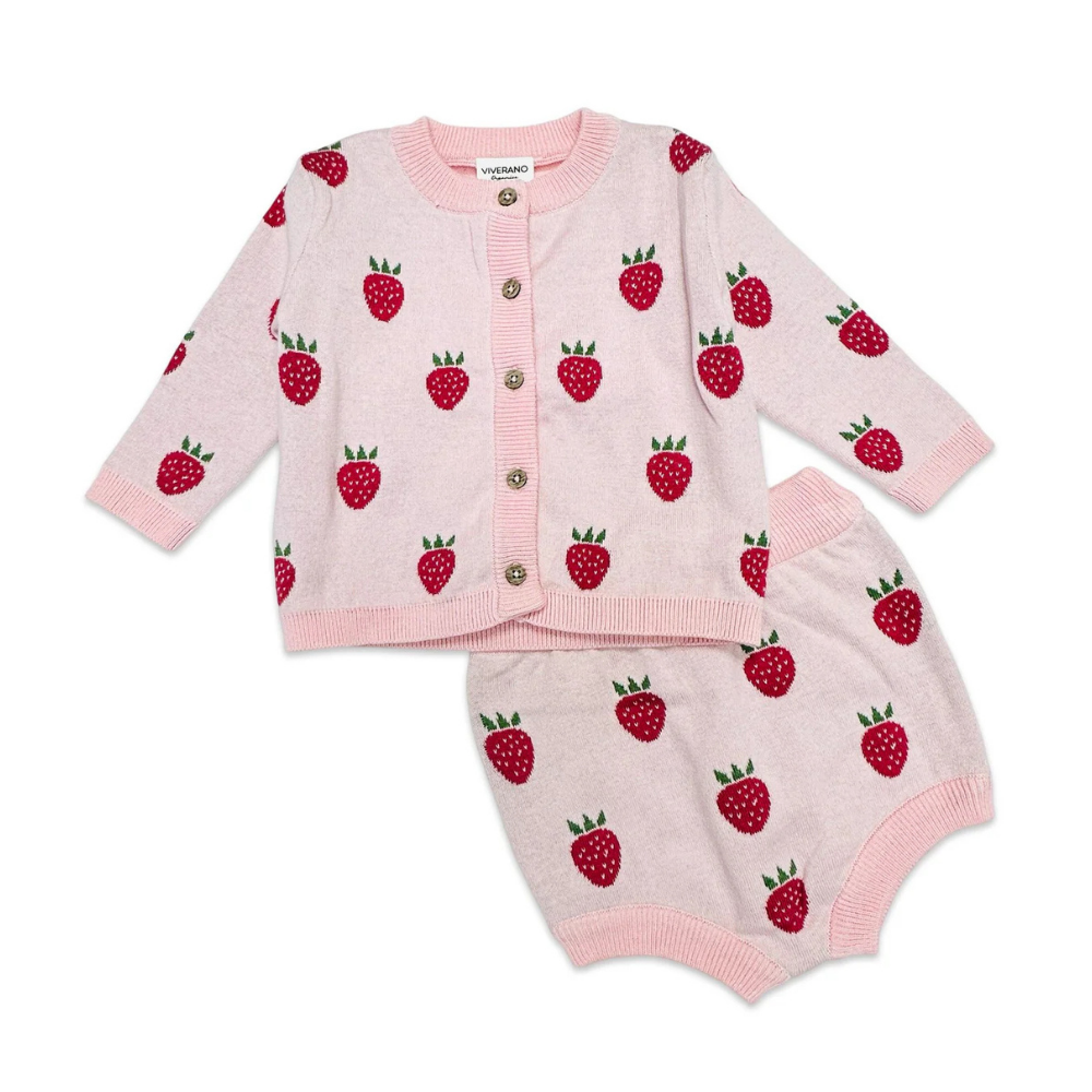Strawberry Jacquard Knit Baby Cardigan, Bloomer 2pc Set (Organic Cotton)