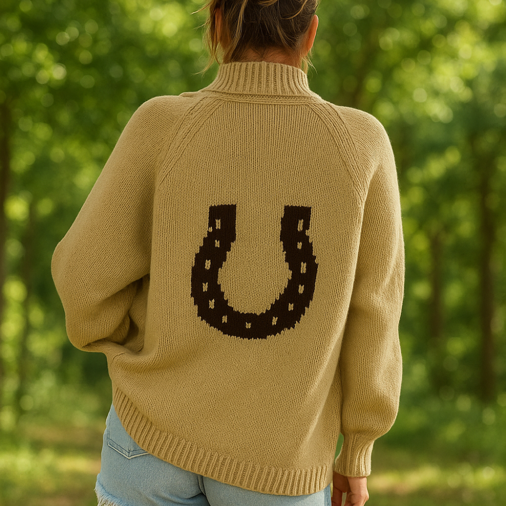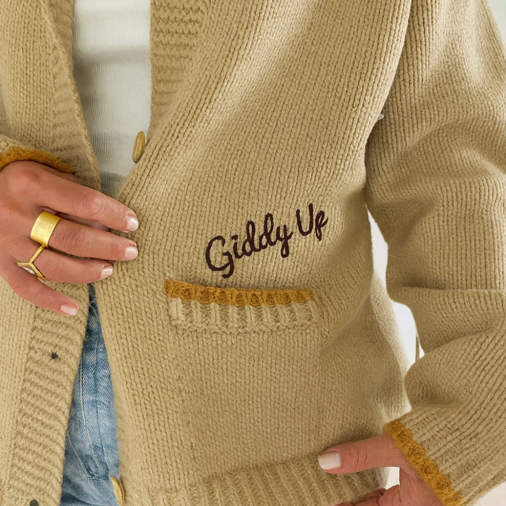 This horseshoe cardigan in a classic beige and brown is the perfect layer year-round. A whimsical "Giddy Up" sewn over the pocket and a soft and snuggly shawl collar will ensure this relaxed fit cardigan is a go-to any time you're chilly.