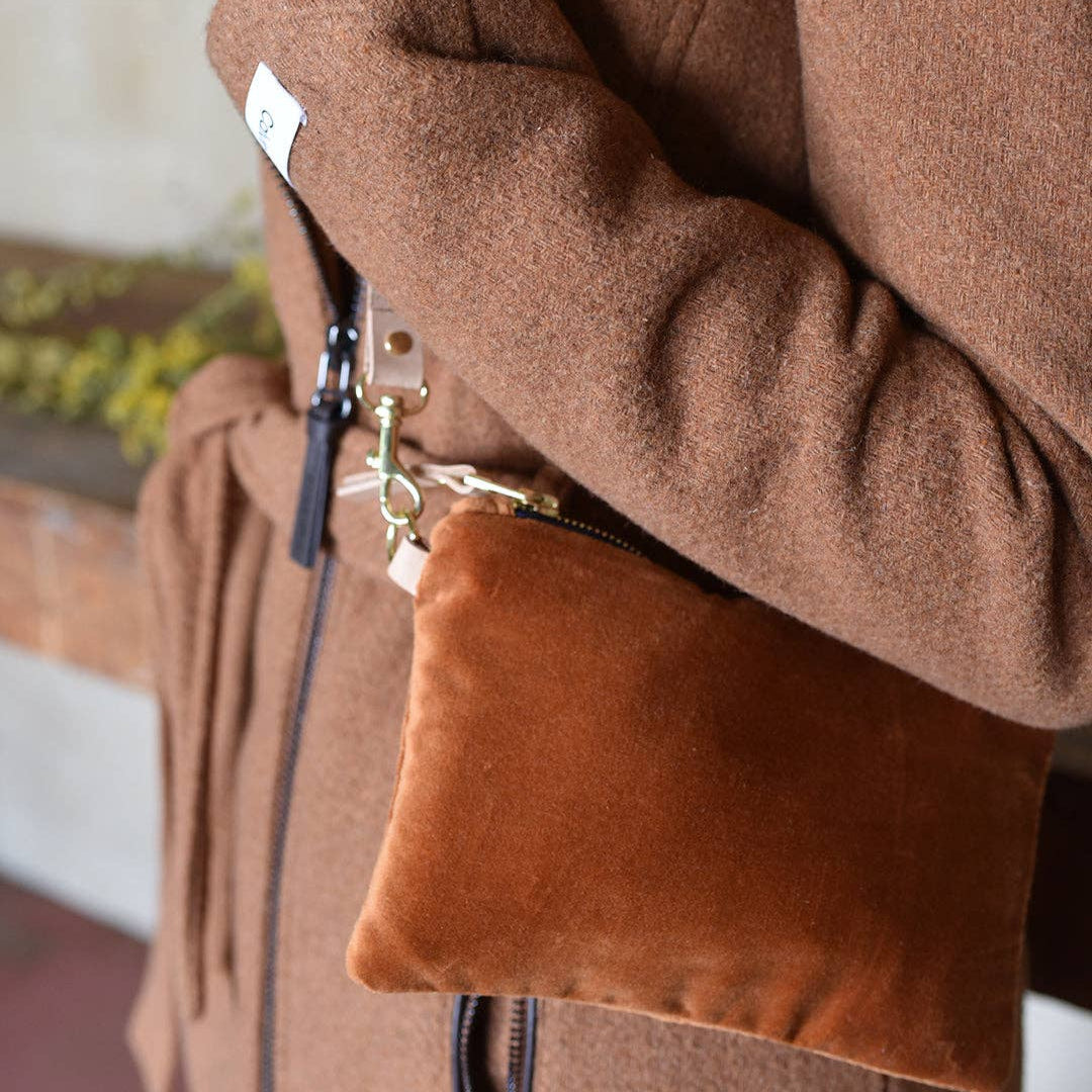 These luxe velvet Ellie wristlets are lined with a fun hand printed navy polka dot design. This wristlet features a second D ring so that a leather strap can be used to wear it as a cross-body or a fanny pack. Crossbody straps are sold separately.
