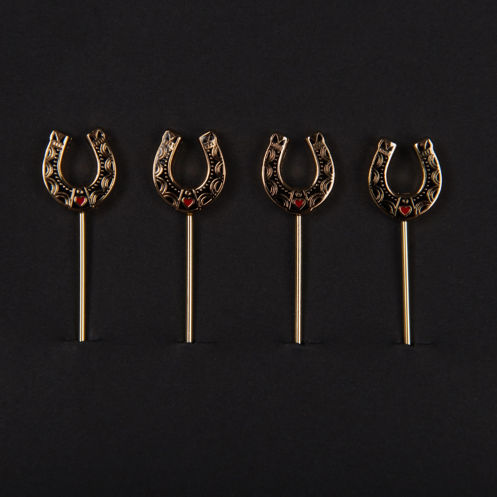 Whether you like it a little bit country or a little bit on the rocks, these snazzy picks make a great way to stick your garnish. Topped with a sweet little western horseshoe for good luck whilst imbibing, this set includes four gold picks with black and red enamel finish, packaged in a custom printed box.