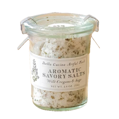 Wild oregano and crushed sage leaves add flavor to European flat crystal salt as a seasoning on potato salad, pizzette, grilled or roasted chicken, and fresh vegetables from the garden. Comes in a 2.6-ounce Weck jar.