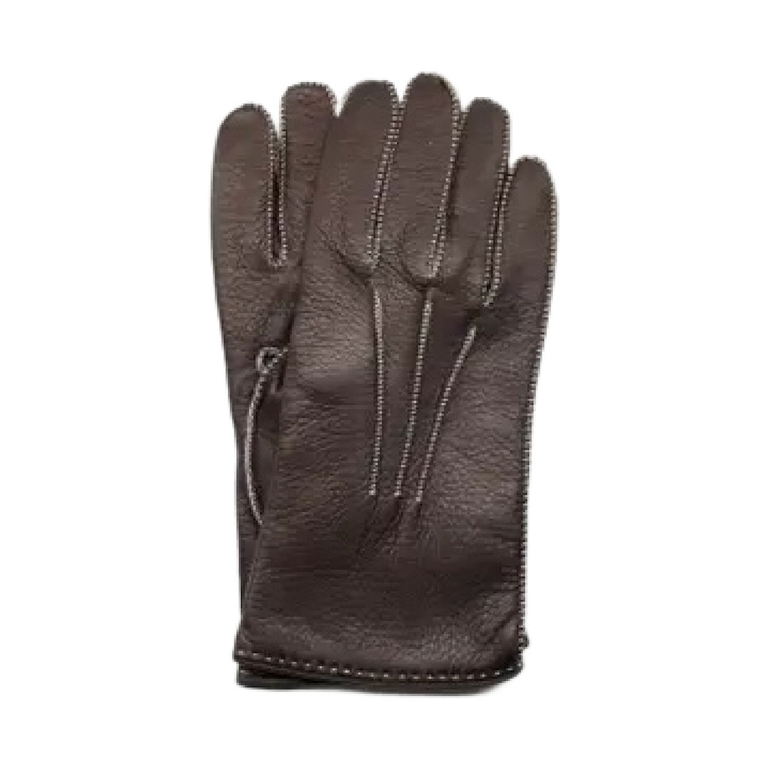 These soft and elegant men's gloves in brown have three fancy contrasting cords on top, and are made of deerskin with a cashmere lining.