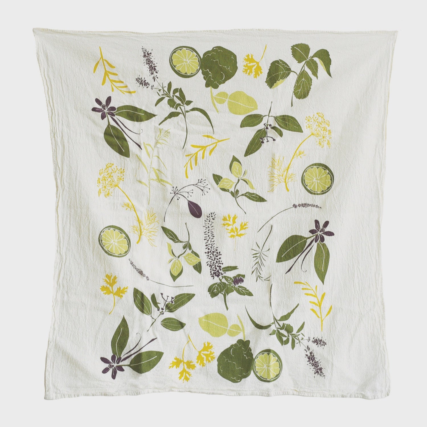 This towel is scattered with herbs used in cocktail favorites like basil, mint, cinnamon, lemon verbena and kaffir limes to name a few. Screen printed on flour sack cotton to preserve its uniquely soft, absorbent and durable nature, this towel is machine washable and safe to bleach, allowing it to hold up for everyday use. It's the ideal gift for your favorite mixer.