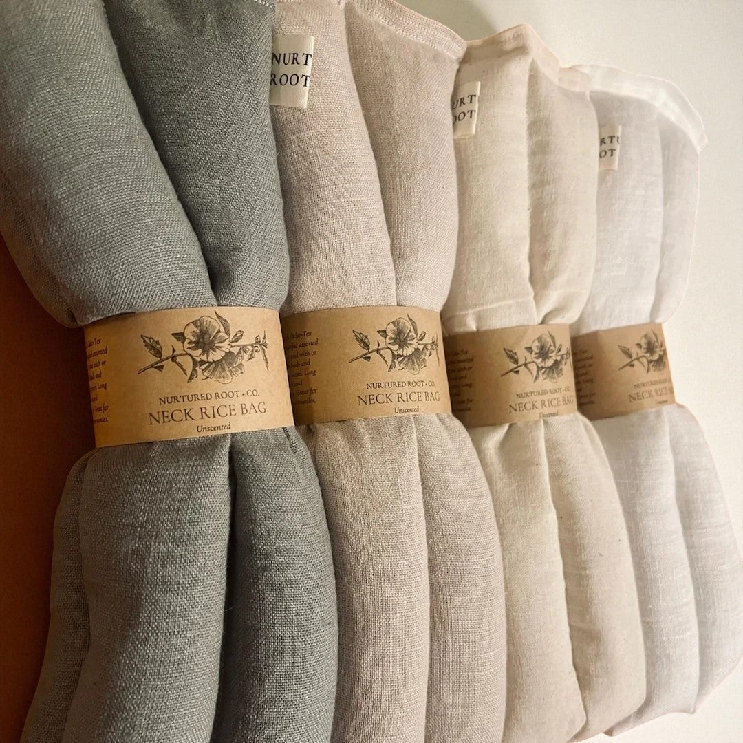 Handmade with Oeko-Tex Standard certified 100% cotton and linen in beautiful assorted neutral colors, filled with jasmine rice and with or without organic lavender/ chamomile buds and essential oils for a very light, relaxing scent. Shape is made to rest along the base of your neck and over shoulders to help aid in relaxation, sleep, and warmth/ cool for headache relief.