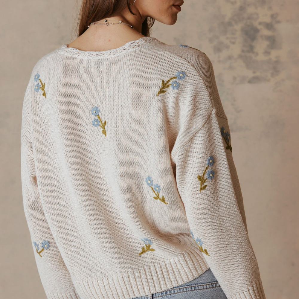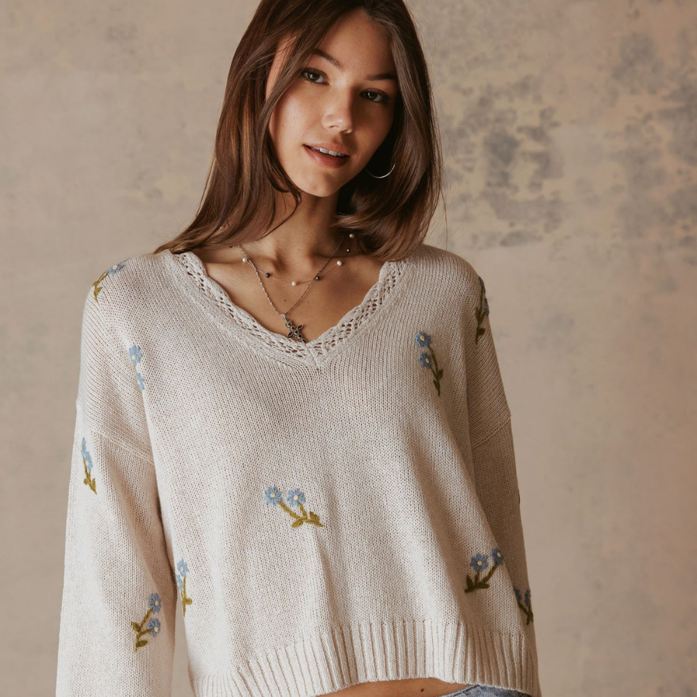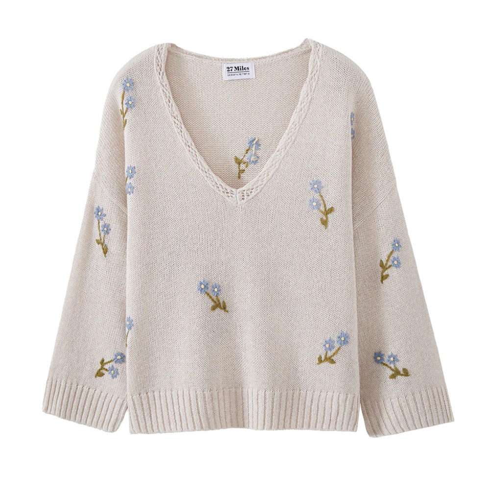 Wide sleeve openings, a crocheted neckline and a delicate floral embroidery are super feminine and springy on this v-neck pullover. Soft and refined with a modern silhouette, the thoughtful detailing gives this sweater from 27 Miles a romantic, elevated look.