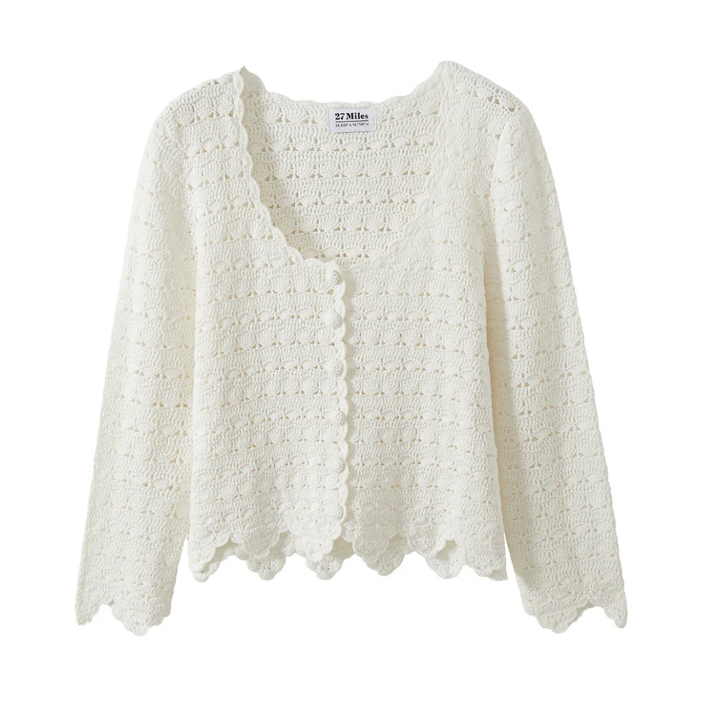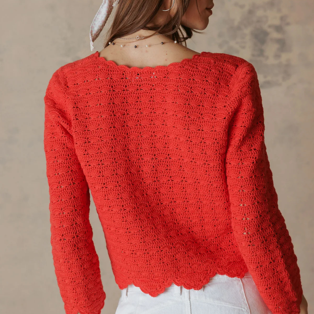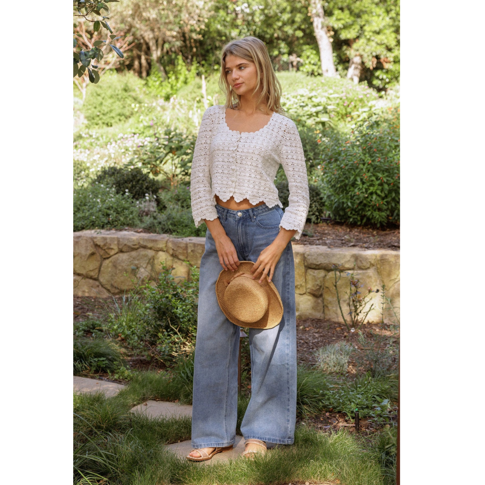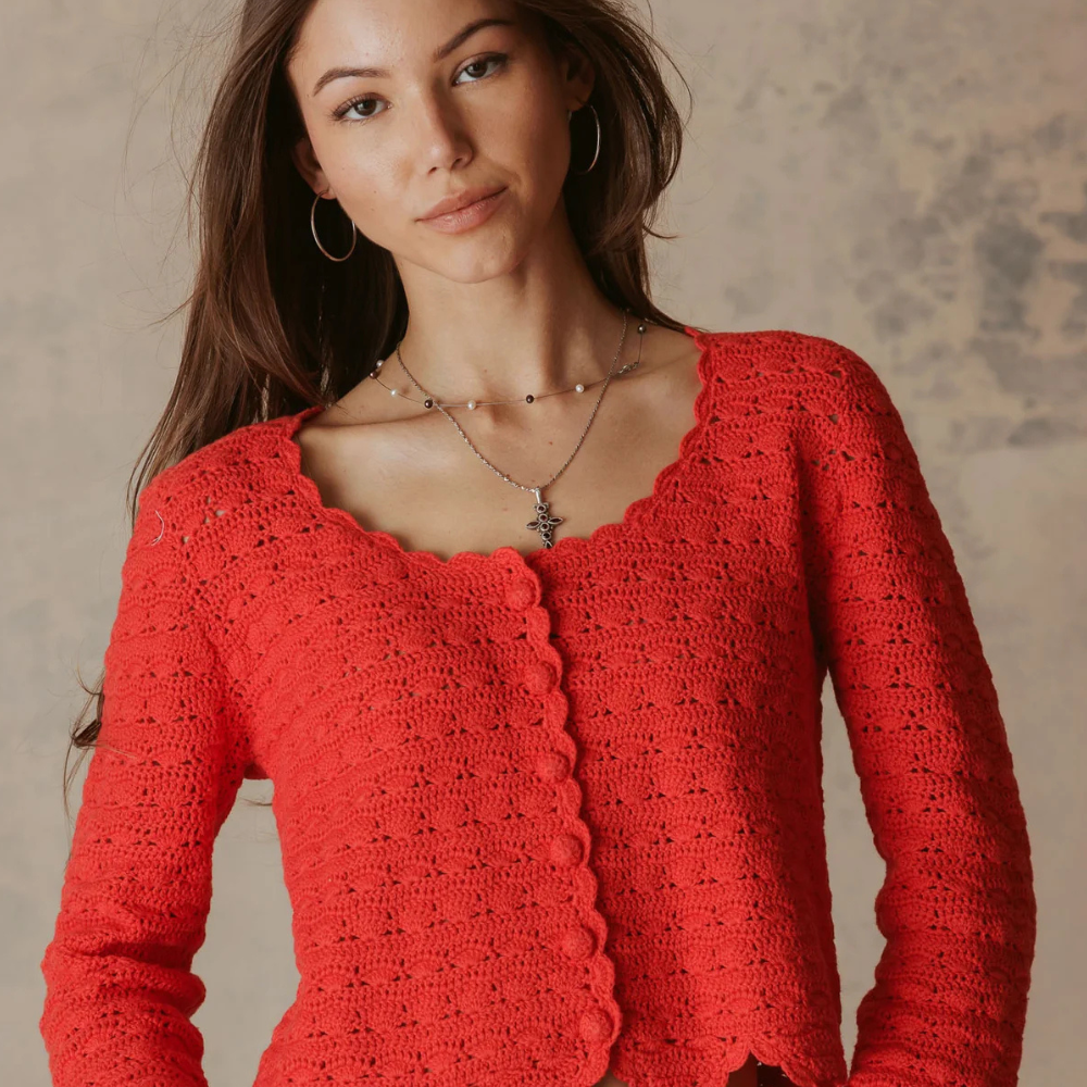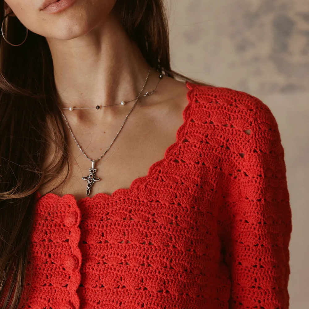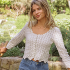 The Rey is a cropped cotton cardigan designed to be worn more like a top. The deep scoop neckline and three-quarter-length sleeves make this a beautiful option for spring paired with high-waisted jeans or trousers, or layered over a dress. Hand-crocheted with an artisanal feel, it's finished with scalloped edges at the hem and cuffs for an elevated, feminine touch.
