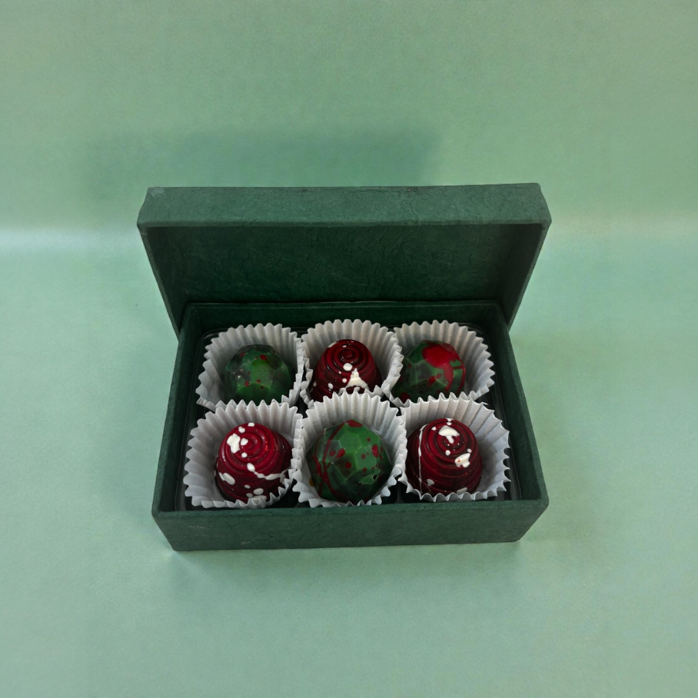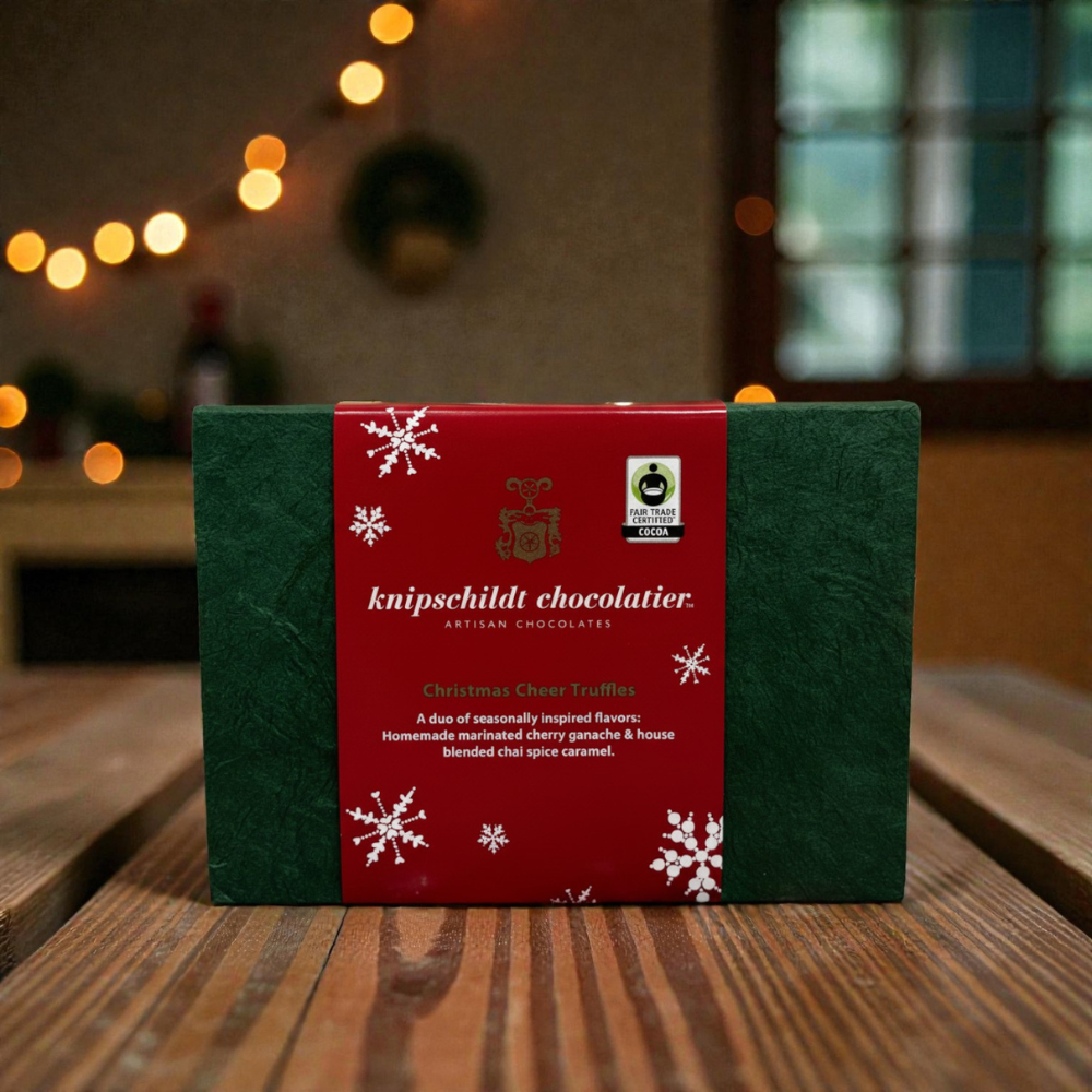 Show someone you love you are thinking of them with this thoughtful collection of truffles with two festive flavors to delight the taste buds: chai spice caramel and cherry cordial. It's a new assortment for 2025 from Knipschildt Chocolatier. The chai spice caramel is infused with cinnamon, cardamom, nutmeg, ginger and cloves, while the cherry cordial is filled with cherry ganache made from Master Chocolatier Fritz Knipschildt's marinated cherries. The red, white and green festive bonbons bring cheer to those who recieve them.