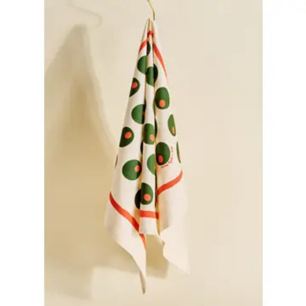 Featuring a cheeky all-over olive print with some pimento red, it’s the perfect blend of function and fun. Whether you're drying dishes, dressing up your bar cart, or laying out a snack spread, this towel brings a hint of happy hour to the kitchen or bar cart.