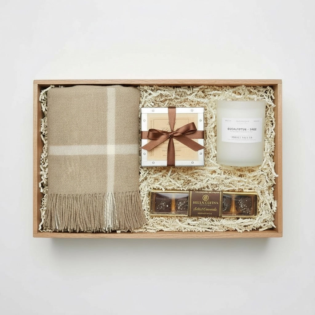 An invitation to slow down and settle in. This comforting collection pairs a soft throw with sweet treats, rich hot chocolate, and a soothing candle to set the mood. Thoughtfully curated for quiet evenings, winter weekends, or anyone who loves a little extra warmth and indulgence.