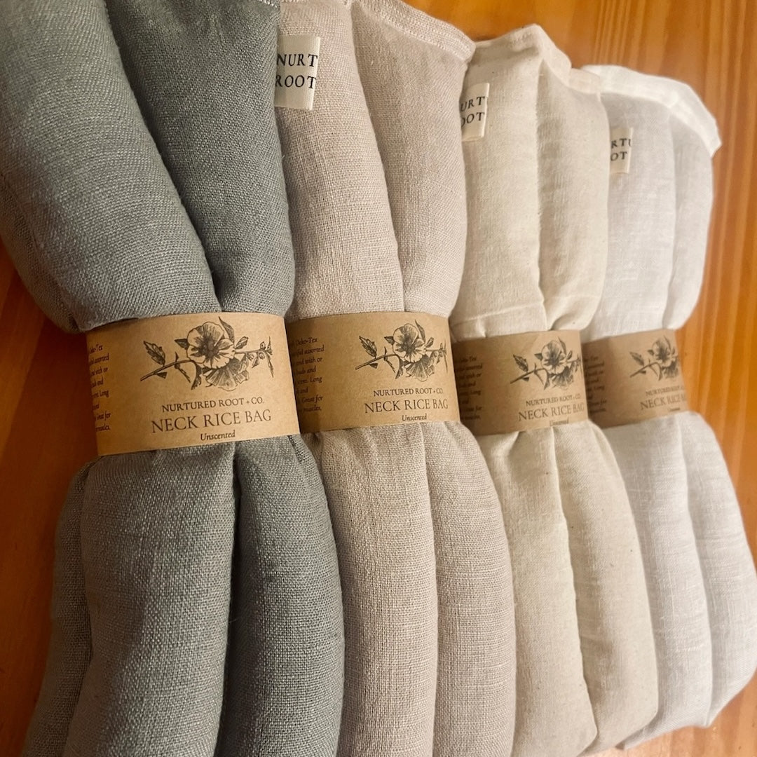 Handmade with Oeko-Tex Standard certified 100% cotton and linen in beautiful assorted neutral colors, filled with jasmine rice and with or without organic lavender/ chamomile buds and essential oils for a very light, relaxing scent. Shape is made to rest along the base of your neck and over shoulders to help aid in relaxation, sleep, and warmth/ cool for headache relief.