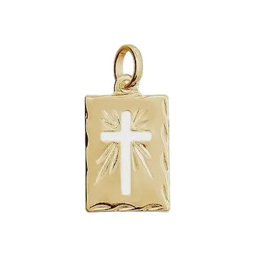 This vintage-inspired hollow cross tag plate pendant is 18k gold-filled featuring diamond-cut borders. This symbol of faith has been worn for centuries and can be paired with a variety of chains of both thin and medium thickness, from box chains to cable chains.