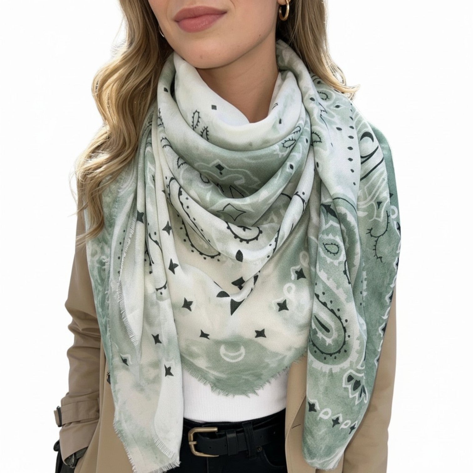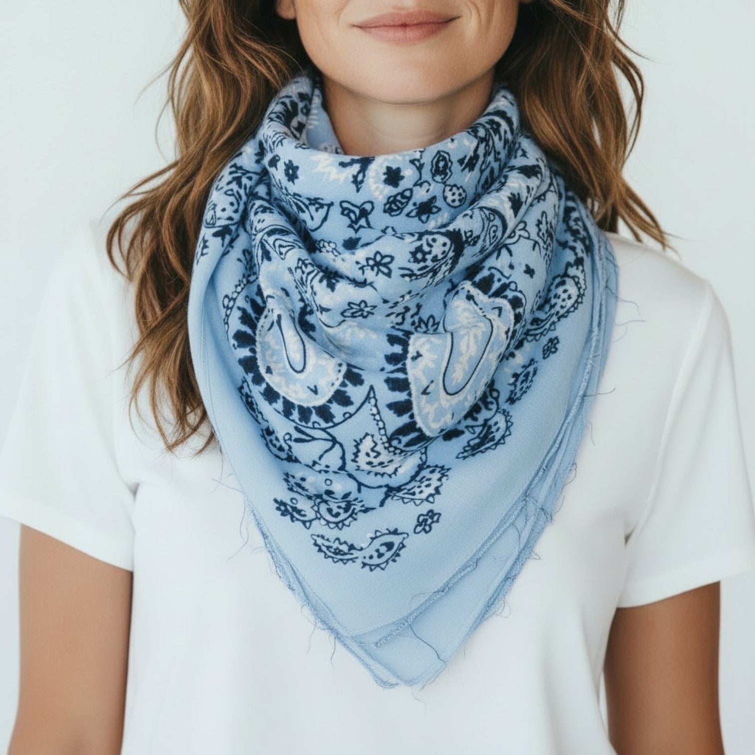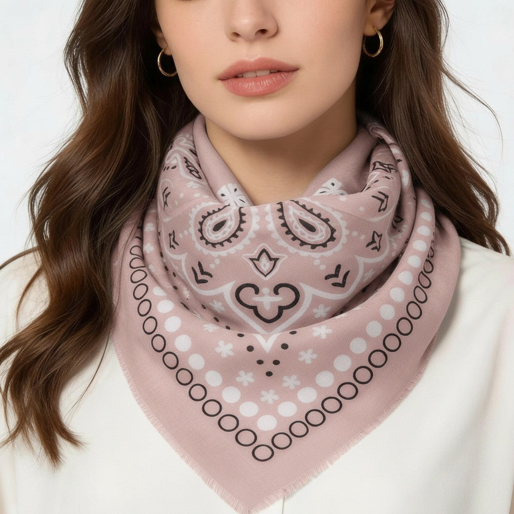 Designed to elevate even the simplest look, this oversized square scarf features a timeless bandana pattern with a modern edge. Crafted from a soft viscose-cotton blend, it has a lightweight drape with just enough warmth for year-round wear. Fold it, knot it, or wear it loose over the shoulders, the styling options are endless.