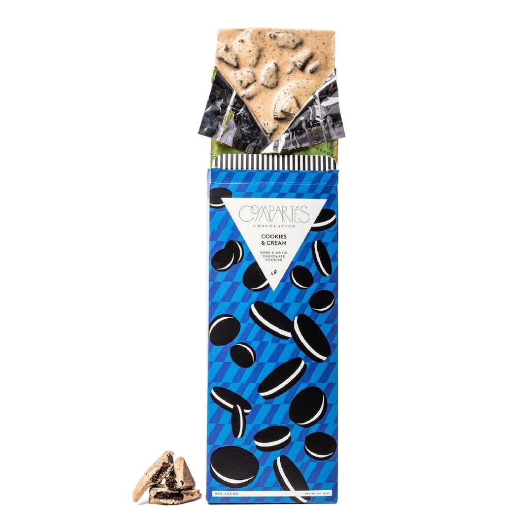Compartés's amazing Cookies & Cream chocolate bar blends white and dark chocolate and packs it full of sandwich cream cookies in this must-try chocolate bar. Each one is handmade in the chocolatier's Los Angeles kitchens.