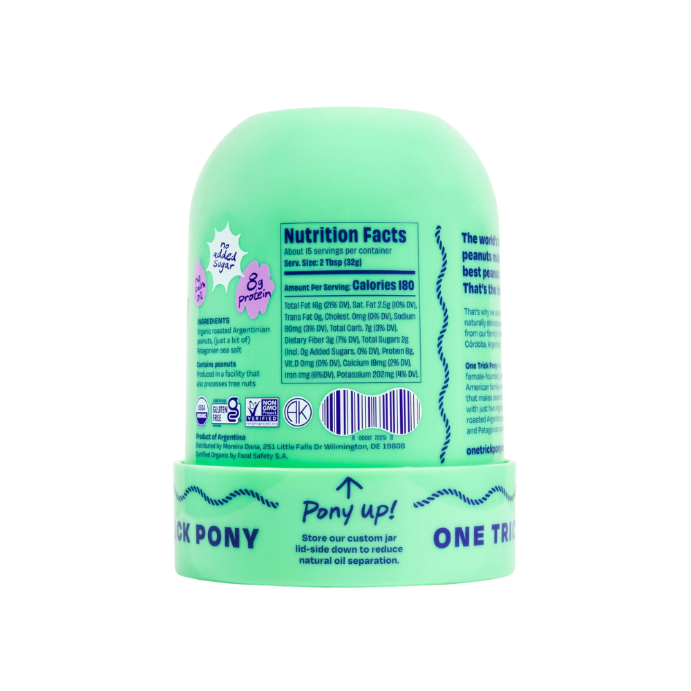 One Trick Pony is a female founded, Argentinian American family run company making peanut butter with organically grown Argentinian peanuts and Patagonian sea salt. Native to South America, these peanuts thrive in the region’s climate, creating a naturally sweet flavor. With no additives, oils, or sugars, each jar is thoughtfully designed to reduce oil separation and deliver pure peanut butter goodness in every spoonful.
