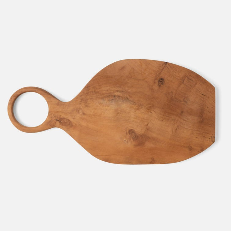 Made with a slice of natural teak, Kade's handmade shape is an artisan touch for your dining table. This large tray is finished with an oversized hanging ring making it well-suited for serving or display.