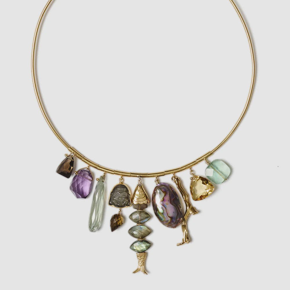 This gold collar necklace features assorted charms: a labradorite fish, coral branch, laughing buddha, abalone, and semi-precious stones.
