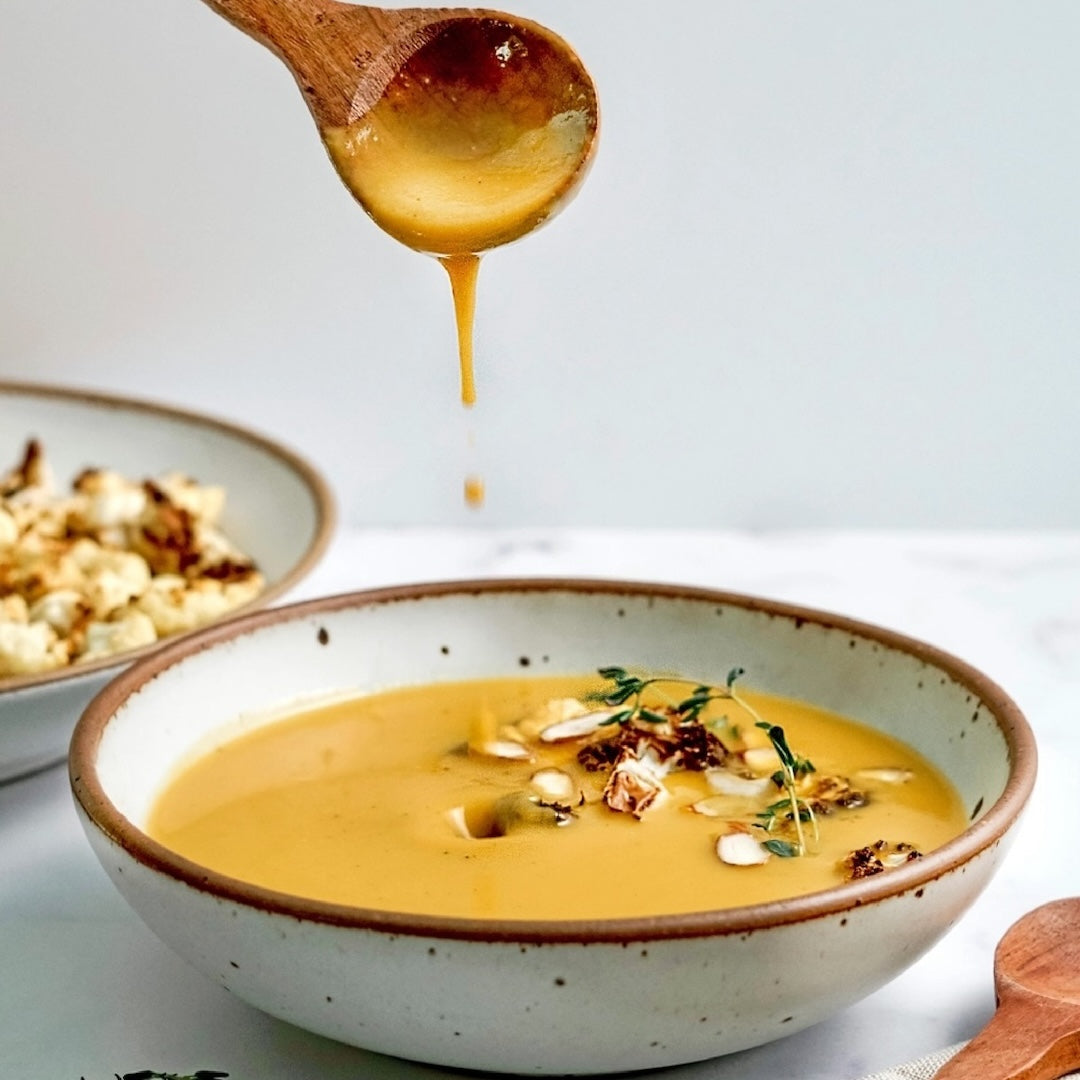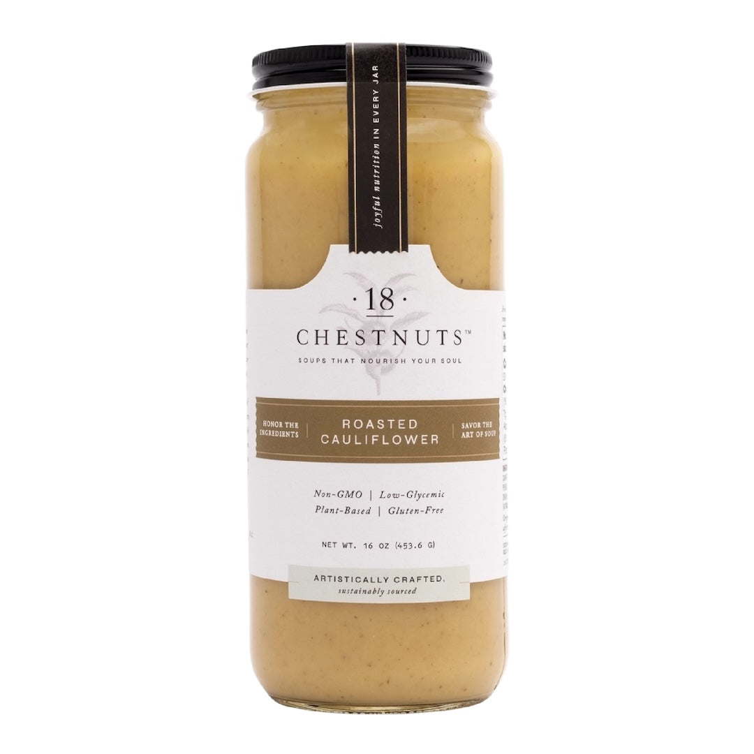 This vegan house made soup by 18 Chestnuts Soups has a golden hue and aromatic flavor. High fiber and protein packed without added sugar, this roasted cauliflower and fennel soup is blended to provide a healthy and satisfying lunch or dinner option. Each serving is rich in vitamins C and K, calcium and magnesium.