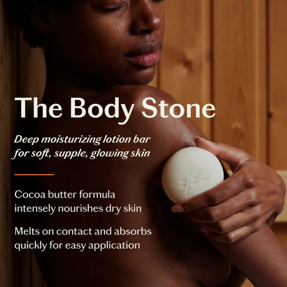 The Unscented Stone is Kate McLeod's purest Body Stone blend, formulated for the most sensitive skin. The Body Stone is a highly efficacious cocoa butter concentrate chock full of fatty acids to deeply moisturize dry skin. This body butter bar glides on like silk and absorbs quickly, sealing in hydration without any greasy residue. To apply: Start with warm, dry skin—ideally after a shower or bath. Prep the Body Stone for use by warming it between your palms so it begins to soften with your body heat. Glide the Body Stone onto your skin with just a few strokes. Gently massage oils into your skin. Comes in a plastic-free storage case.